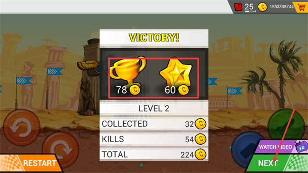 4、关卡胜利后获得【金色奖杯-78金币】【金色星星-60金币】奖励,点击【NEXT】进入下一关,继续挑战。