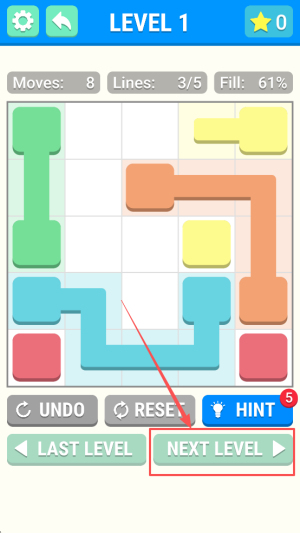 4、完成后点「NEXT LEVEL」;步数不够点「RESET」重画或「HINT」看提示。