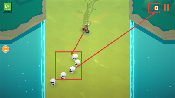 2、驾驶摩托车时避开【白色骷髅头】障碍物,关注右上角分数变化,避免碰撞以保持游戏进度。