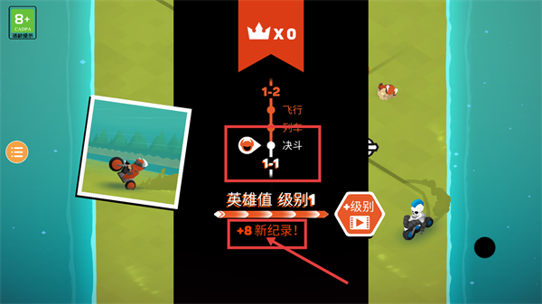 4、完成【1-1】关卡后,获得【+8新纪录】,提升英雄值级别,解锁后续【1-2】等关卡,继续挑战。