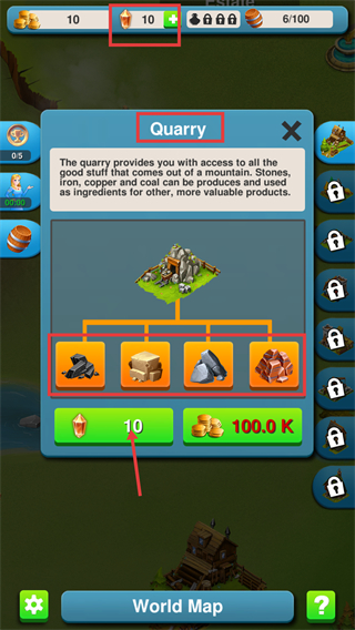 2、消耗【10】个水晶解锁【Quarry】,可获取石头、铁、铜、煤等资源,这些是制作高价值产品的原料。