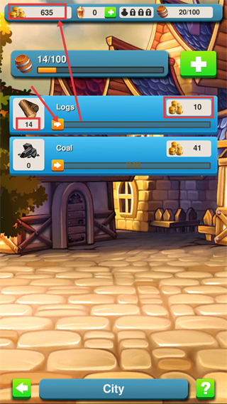 4、在城市界面交易资源,如将【14】个木材卖出可获【10】金币,通过资源交易积累金币提升发展能力。