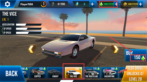 2、在商店消耗【150】绿钻购买【The-Vice】车辆,提升赛车性能,助力关卡挑战。