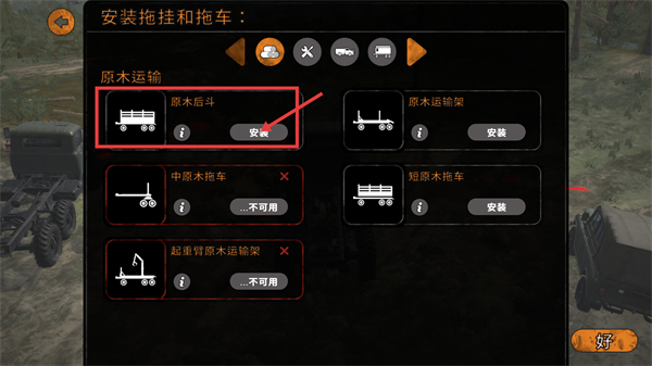 2、安装【原木后斗】,为原木运输任务配备装备,提升运输能力以完成相应任务。