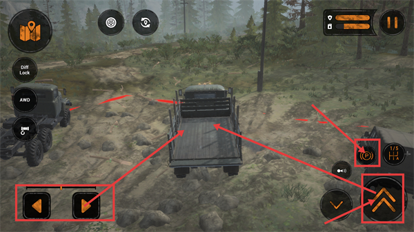 3、驾驶时利用方向键、加速键和驻车键,操控车辆在泥泞地形中行驶,应对复杂路况。