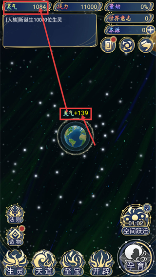 2、关注【灵气】数值增长,通过积累【灵气+139】提升世界基础资源,为后续发展奠基。