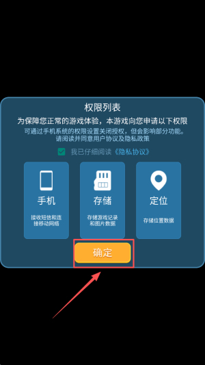 1、进入游戏:阅读权限列表后勾选“我已仔细阅读《隐私协议》”并点击“确定”进入游戏模式。