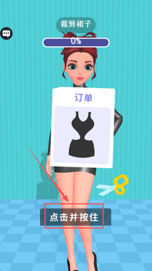 3、开始游戏:在关卡界面,查看“裁剪裙子 0%”进度条,按住屏幕拖动剪刀裁剪布料。