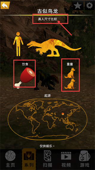 3、查看【古似鸟龙】的【真人尺寸比较】,了解其【饮食-肉食】和【重量】等属性,全面掌握恐龙信息。