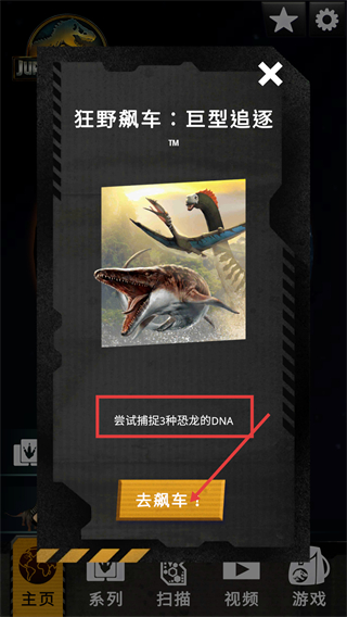 1、参与【狂野飙车:巨型追逐】活动,点击【去飙车】,目标捕捉3种恐龙的DNA,开启恐龙DNA收集征程。