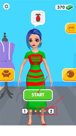 1、点击【START】按钮,开启第【2】阶段服装改造任务,依据上方服装图标开展设计。