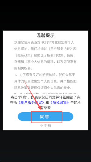 1、进入游戏:首先打开隐私政策界面,点击同意进入游戏主界面。