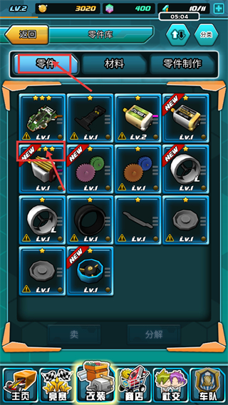 1、进入【零件库-零件】标签,查看带【NEW】标识的新零件,及时管理零件,为四驱车改装做好准备。