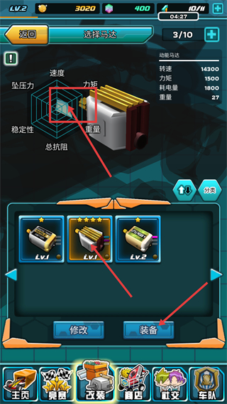 3、选择马达时关注【速度】【力矩】等属性,选好后点击【装备】,提升四驱车动力性能。