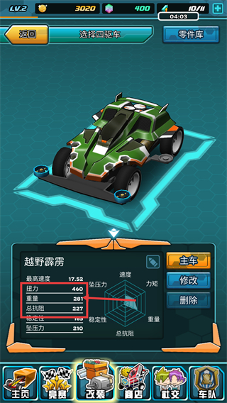 4、改装后查看【越野霹雳】的【扭力-460】【重量-281】等属性,确认改装效果,为竞赛提升战力。