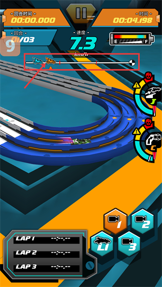 2、比赛中关注赛道上的车辆位置进度条,把控四驱车在赛道上的行驶节奏,提升竞赛表现。
