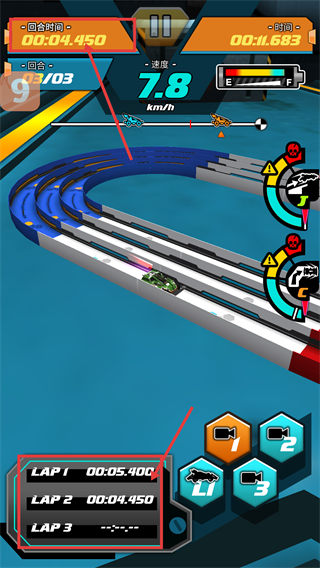 3、竞赛时留意【回合时间-00:04.450】和各圈时间,优化四驱车的行驶效率,争取更好成绩。