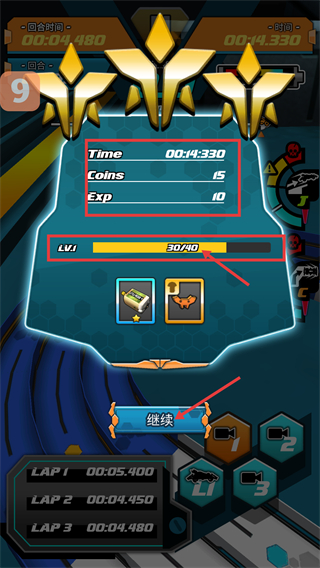 4、竞赛结束后领取【Time-00:14:330】【Coins-15】【Exp-10】奖励,关注等级进度【LV.1-30/40】,点击【继续】推进游戏。