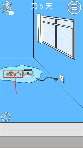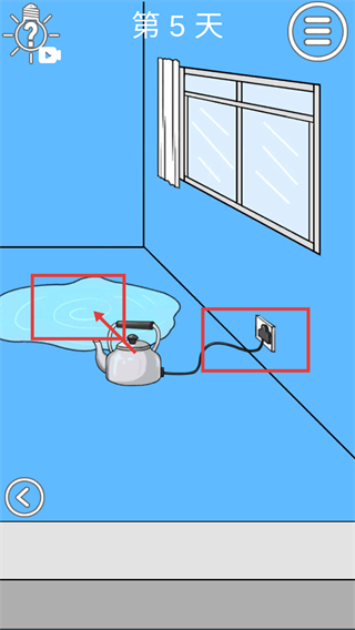 1、在【第5天】场景中,先点击积水区域,再拔掉【电水壶】的插座,消除触电隐患,推进剧情。