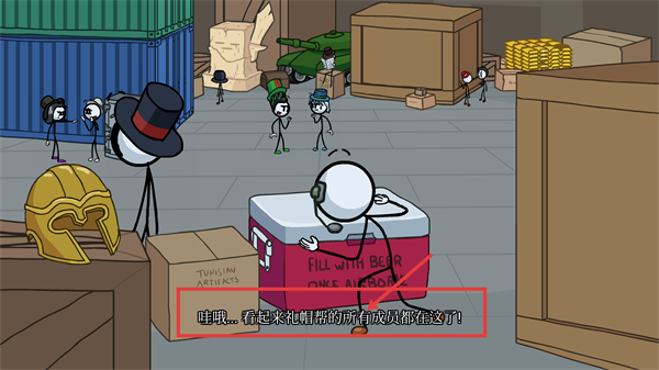 1、在仓库场景中,留意【哇哦…看起来礼帽帮的所有成员都在这了】的提示,观察周围道具与成员分布,为后续任务做准备。