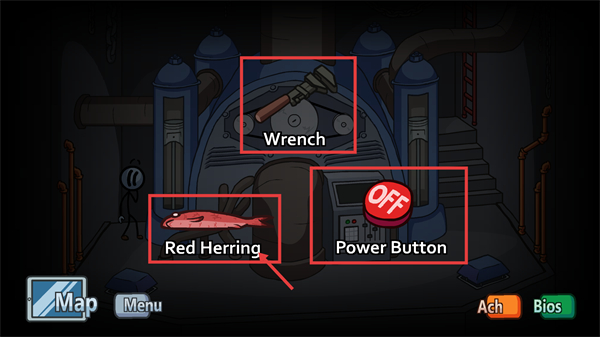 4、在机械区域,识别【Wrench】【Red-Herring】等道具,使用扳手操作,区分干扰项红鲱鱼,通过电源按钮控制设备,完成任务。