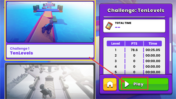 1、在【Challenge:TenLevels】界面,点击绿色【Play】按钮,开启十关轮椅挑战,查看关卡记录,开始游戏进程。