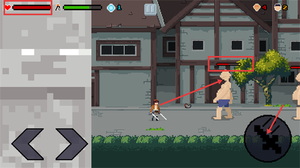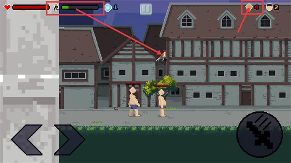 2、战斗时关注左上角血量和攻击条、右上角巨人计数,利用左右移动按钮走位,右侧攻击按钮攻击巨人,留意巨人的血量条。