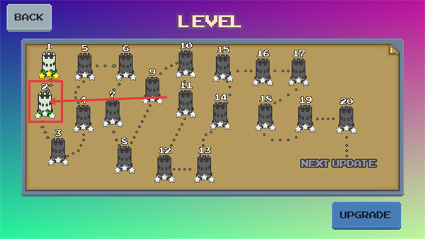 1、在关卡选择界面,点击“Level2”进入第二关,关卡以星级评价,可反复挑战提升星级,完成后解锁后续关卡。