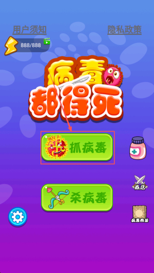 1、进入游戏:首先打开游戏主界面,阅读用户须知后点击隐私政策进入抓病毒模式。