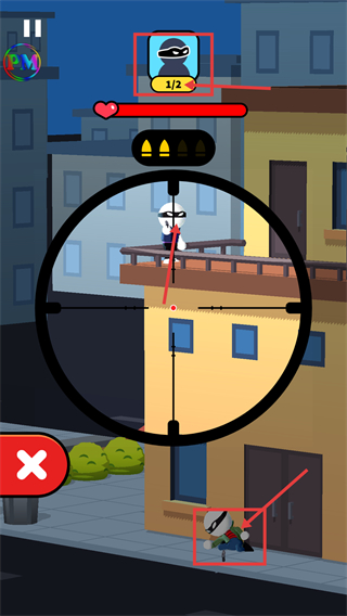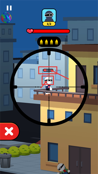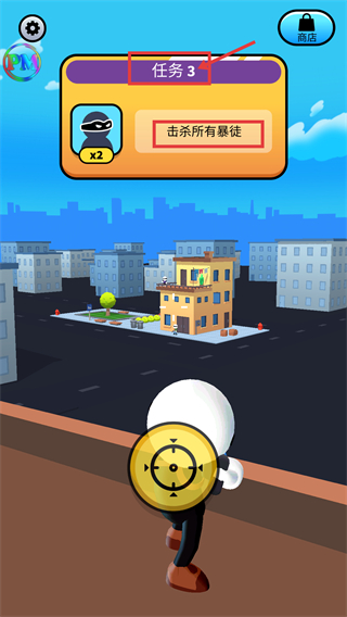 2、进入狙击视角后,留意建筑上和地面的暴徒位置,依次瞄准,确保覆盖所有目标以推进任务。