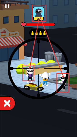 3、场景中混杂无辜者与暴徒,需精准区分目标身份避免误击,考验玩家的观察判断能力,为简单射击玩法增添策略区分度。