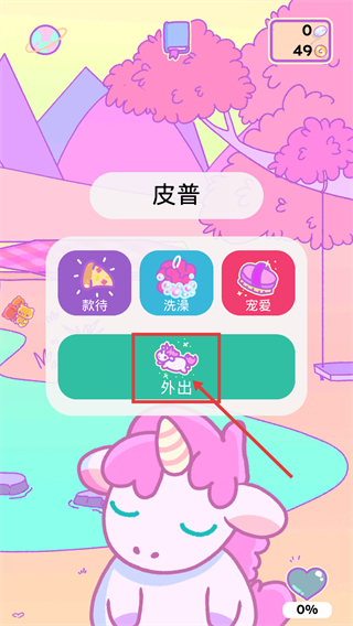 1、点击【外出】按钮,开启独角兽皮普的外出探索,以此获取游戏资源,推进养成进程。