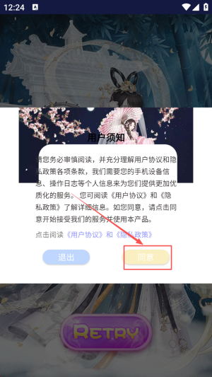 1、阅读协议:浏览用户协议与隐私政策后,点击同意继续。