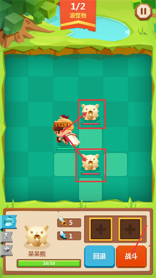2、战斗时注意波数,【1/2-波怪物】阶段,瞄准【呆呆熊】,布置好后点击【战斗】按钮发起进攻。