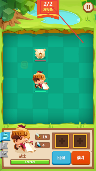 3、推进到【2/2-波怪物】时,利用战士属性提升的优势,继续点击【战斗】按钮,完成最后一波怪物的击败。