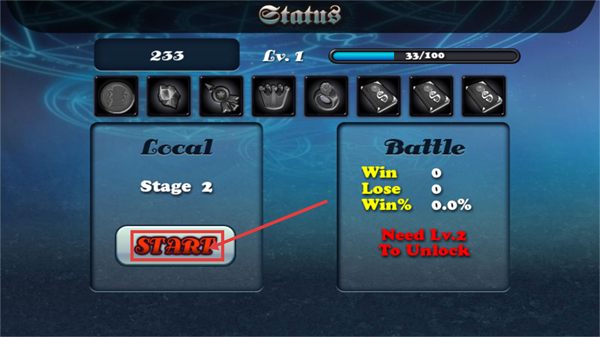 1、点击【START】进入【Stage-2】,当前等级1,进度33/100,开启新关卡挑战。