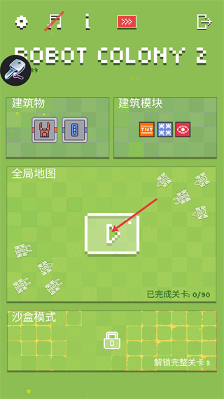 1、进入【Robot-Colony-2】后,点击全局地图的开始按钮,熟悉【建筑物】和【建筑模块】,开启冒险。