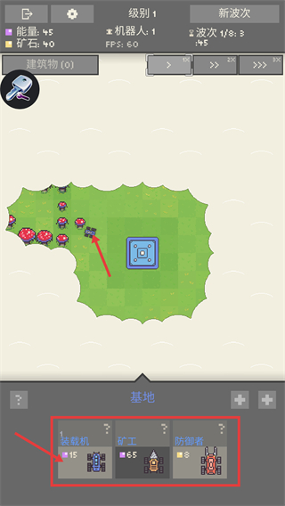2、在级别1,优先建造【装载机】,利用其收集资源,同时了解【矿工】【防御者】的功能,为基地发展奠基。