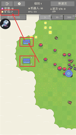 4、收集【矿石-7】,解锁并打开宝箱获取资源,提升机器人数量至10,增强基地战力以应对波次挑战。