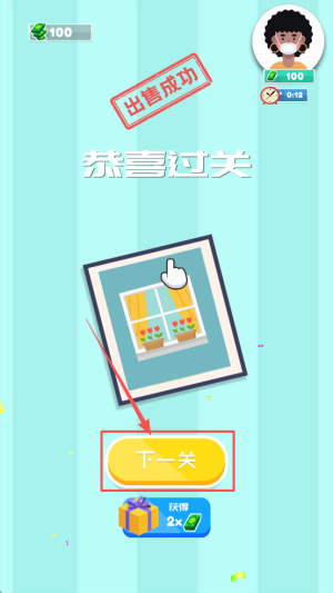 4、领取奖励:出现100 100出售成功恭喜过关,点击下一关继续。