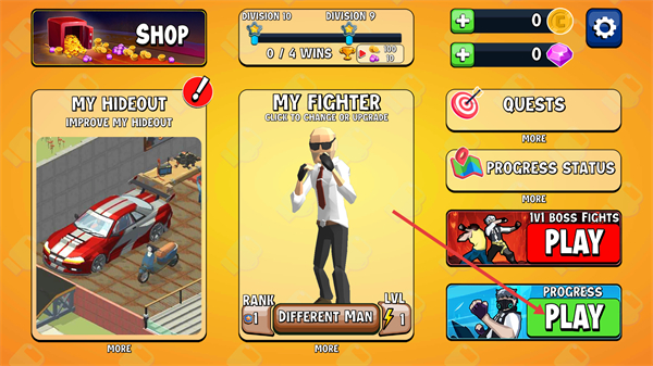 1、进入游戏界面,点击绿色【PLAY】按钮,熟悉【Different-Man】角色和【SHOP】【MY-HIDEOUT】等功能,开启战斗冒险。