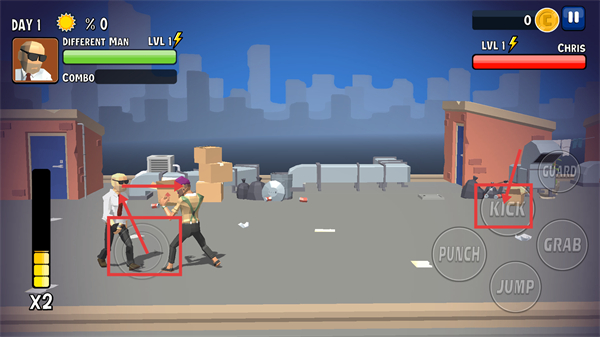 2、战斗时利用移动控制和【KICK】技能,灵活操作角色【Different-Man】,对敌人发起有效攻击。
