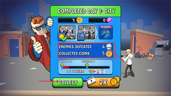 4、完成【Day-1-City】关卡后,击败4个敌人并收集5金币,点击【COLLECT】领取奖励,为后续战斗积累资源。