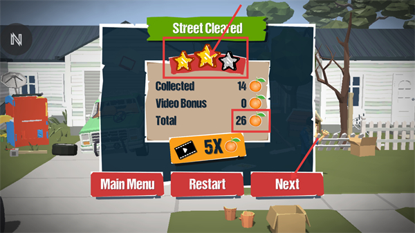 4、通关后可获得星级评价与【橘子-26】奖励,点击【Next】按钮进入下一关,挑战新街区。