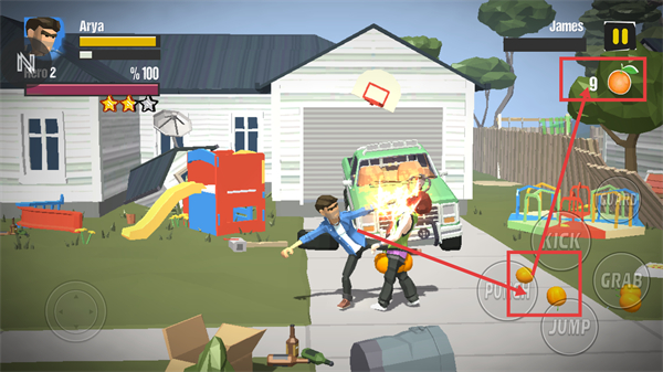3、战斗中收集【橘子-9】等资源,搭配【KICK】【PUNCH】等技能组合战斗,同时积累资源提升收益。