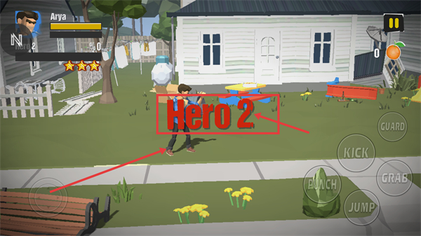 1、进入【Hero-2】游戏,操控角色在街区移动,熟悉左侧移动键与右侧战斗按键布局,为后续战斗做准备。