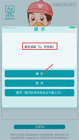 1、在提示界面点击【确定】,读取【0】号存档,继续游戏进程。