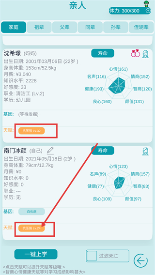 3、在亲人界面关注【抗压强-Lv.32】和【抗压强-Lv.24】的天赋,这些天赋将影响角色的学习与发展效果。