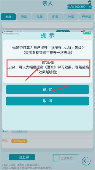 4、在提示界面点击【确定】,提升【抗压强-Lv.24】等级,可大幅度提高《潜水》学习效果,等级越高效果越明显。