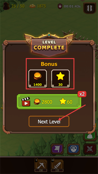 4、关卡完成后获取【Bonus】-【1400】金币与【30】星星,点击【NextLevel】可挑战后续关卡。